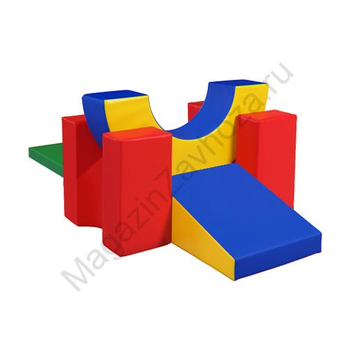 Кожзам и Поролон. Размеры: 1400х1100х800мм Состоит из 5ти модулей. Полукольцо: диам.900мм, ширина200мм -1 шт. Подпорка: 600х300х600 -2 шт. Горка: 600х500х300 -1 шт. Мат:600х500х200 -1шт. Цвета: Красный,Синий,Желтый,Зеленый