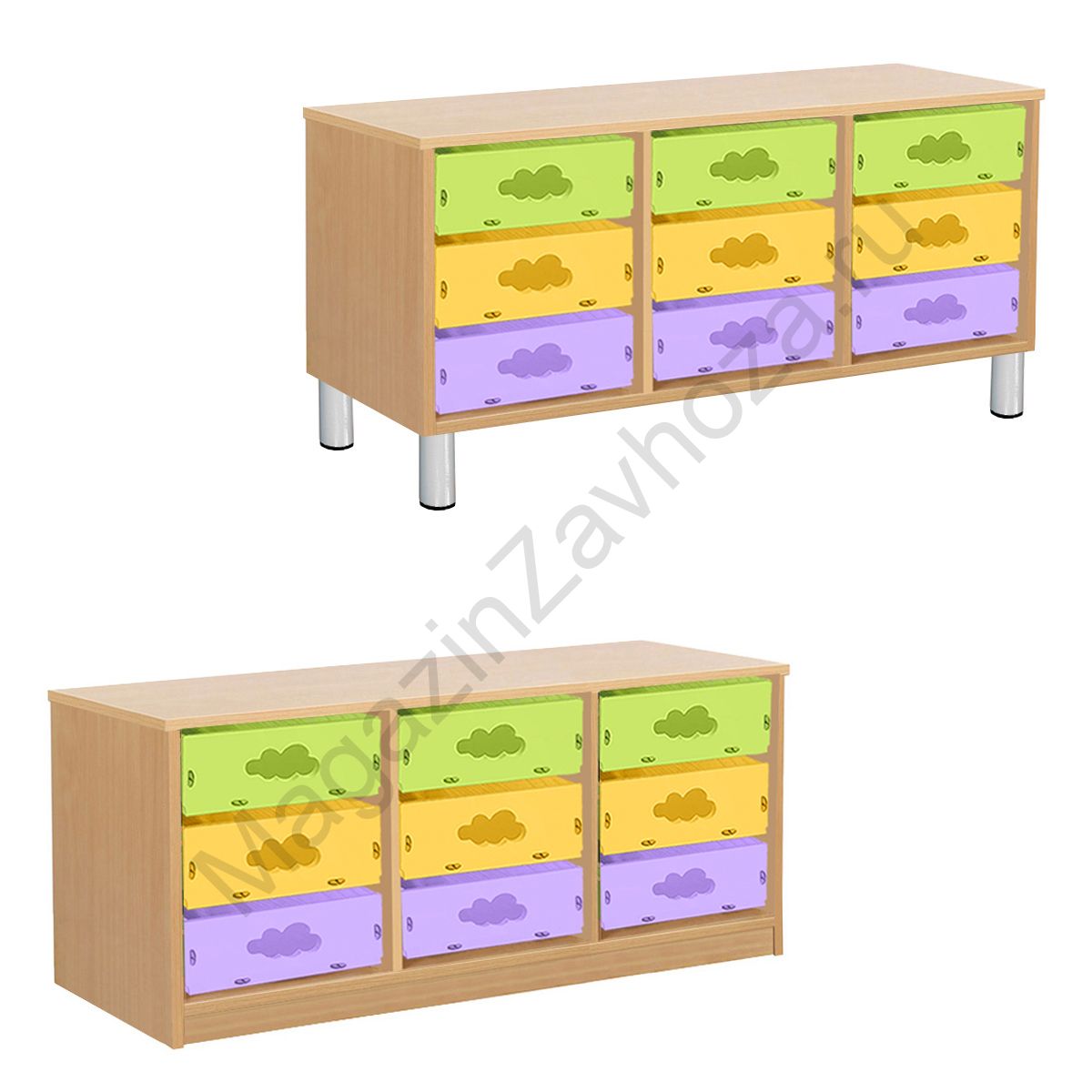Из ЛДСП Бук или Цветного на цоколе р-ры: 976х450х500мм На метел.ножках р-ры: 976х450х540мм Вес:31кг Объём:0,045м/куб Контейнер МДФ:300х420х100мм - 9шт. цвета - ЛАЙМ, ГОЛУБОЙ, ОРАНЖЕВЫЙ, РОЗОВЫЙ, ЖЕЛТЫЙ, ИРИС. Направляющий полозок алюминий.