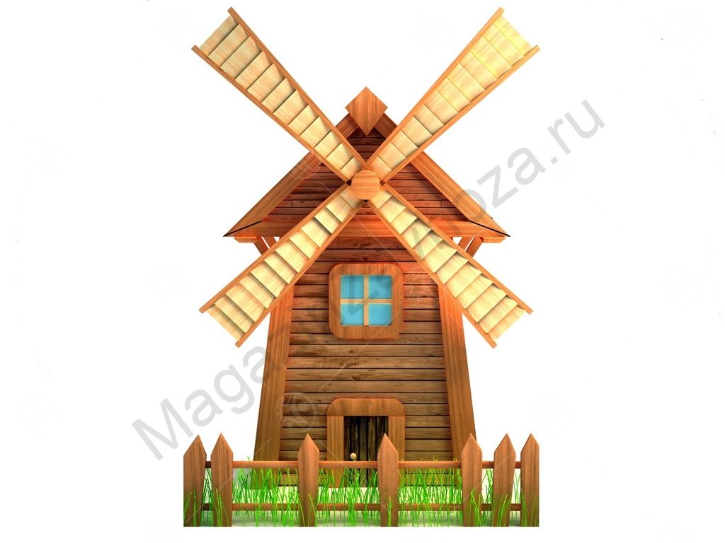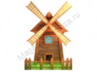 Театральная декорация "Мельница" выполнена из МДФ, с нанесением полноцветного рисунка с двух сторон. Высота декорации 1,2м, ширина - 0,95м. Мельница оснащена вращающимися крыльями.