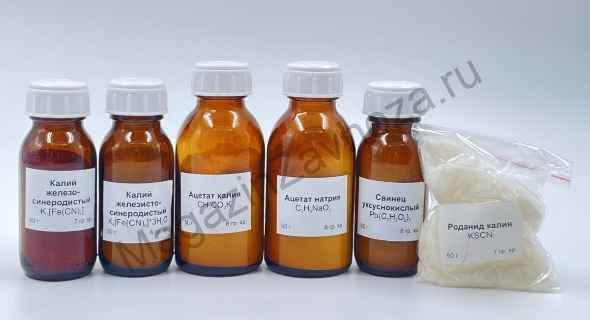 <p><strong>Этот набор  – идеальное решение для обучающих экспериментов по химии! Он создан специально для использования в школах и включает всё необходимое для успешного выполнения демонстраций и лабораторных работ согласно учебной программе.</strong></p> <p><span style="font-size: 14pt;"><strong>Состав набора:</strong></span></p> <table style="border-collapse: collapse; width: 451pt; border-width: 1px; border-spacing: 0px; margin-left: 0px; margin-right: auto; height: 134.344px;" border="1" width="600" cellspacing="0" cellpadding="0"><colgroup><col style="mso-width-source: userset; mso-width-alt: 14555; width: 299pt;" width="398"> <col style="width: 76pt;" span="2" width="101"> </colgroup> <tbody> <tr style="height: 22.3906px;"> <td class="xl66" style="height: 22.3906px; width: 299pt; border-width: 1px; padding: 0px;" width="398" height="20">Калия гексацианоферрат (II) 3-в - 0,05.</td> <td class="xl67" style="width: 76pt; border-width: 1px; padding: 0px; height: 22.3906px;" width="101">0,050</td> <td class="xl68" style="border-width: 1px; border-left-style: none; width: 76pt; padding: 0px; height: 22.3906px;" width="101">кг.</td> </tr> <tr style="height: 22.3906px;"> <td class="xl66" style="height: 22.3906px; width: 299pt; border-width: 1px; padding: 0px;" width="398" height="20">Калия гексацианоферрат (III) - 0,05</td> <td class="xl67" style="border-width: 1px; padding: 0px; height: 22.3906px;">0,050</td> <td class="xl68" style="border-width: 1px; border-left-style: none; padding: 0px; height: 22.3906px;">кг.</td> </tr> <tr style="height: 22.3906px;"> <td class="xl66" style="height: 22.3906px; width: 299pt; border-width: 1px; padding: 0px;" width="398" height="20">Калия роданид - 0,05.</td> <td class="xl67" style="border-width: 1px; padding: 0px; height: 22.3906px;">0,050</td> <td class="xl68" style="border-width: 1px; border-left-style: none; padding: 0px; height: 22.3906px;">кг.</td> </tr> <tr style="height: 22.3906px;"> <td class="xl66" style="height: 22.3906px; width: 299pt; border-width: 1px; padding: 0px;" width="398" height="20">Калия ацетат - 0,05.</td> <td class="xl67" style="border-width: 1px; padding: 0px; height: 22.3906px;">0,050</td> <td class="xl68" style="border-width: 1px; border-left-style: none; padding: 0px; height: 22.3906px;">кг.</td> </tr> <tr style="height: 22.3906px;"> <td class="xl66" style="height: 22.3906px; width: 299pt; border-width: 1px; padding: 0px;" width="398" height="20">Натрия ацетат - 0,05.</td> <td class="xl67" style="border-width: 1px; padding: 0px; height: 22.3906px;">0,050</td> <td class="xl68" style="border-width: 1px; border-left-style: none; padding: 0px; height: 22.3906px;">кг.</td> </tr> <tr style="height: 22.3906px;"> <td class="xl69" style="height: 22.3906px; width: 299pt; border-width: 1px; padding: 0px;" width="398" height="20">Свинца (II) ацетат - 0,05.</td> <td class="xl69" style="width: 76pt; border-width: 1px; padding: 0px; height: 22.3906px;" width="101">0,050</td> <td class="xl70" style="border-width: 1px; border-left-style: none; width: 76pt; padding: 0px; height: 22.3906px;" width="101">кг.</td> </tr> </tbody> </table>
