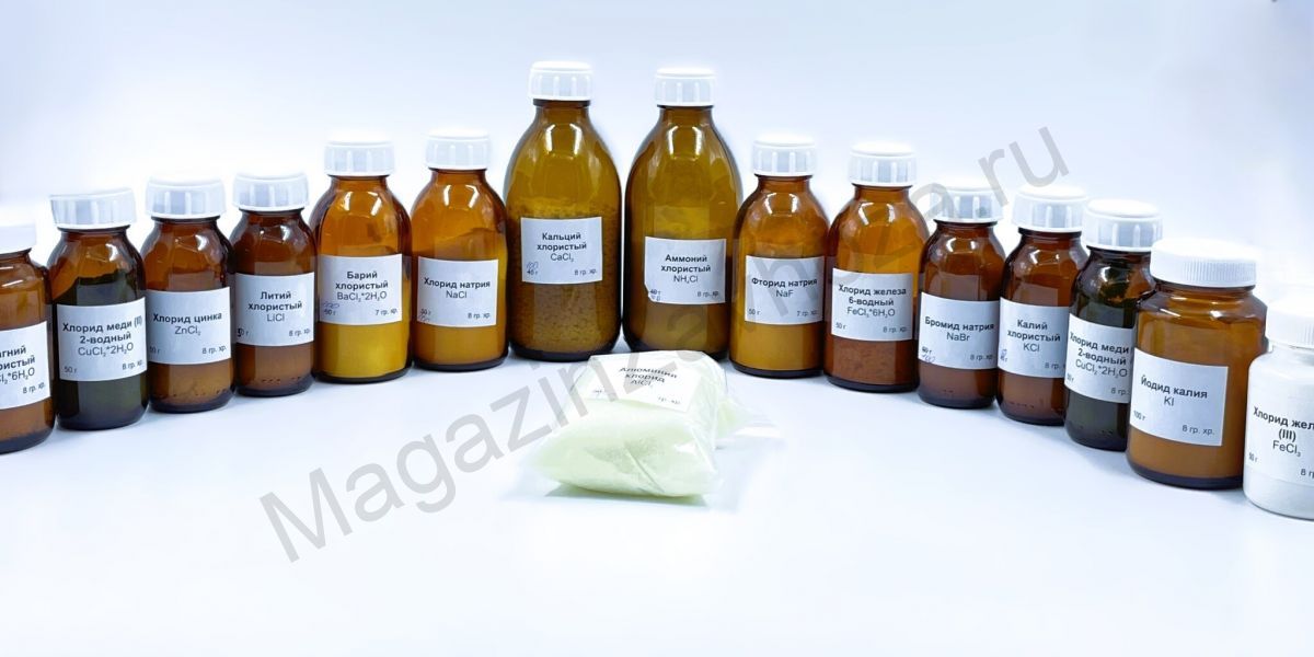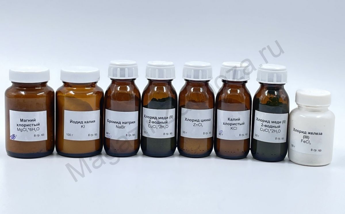 <p><strong>Этот набор  – идеальное решение для обучающих экспериментов по химии! Он создан специально для использования в школах и включает всё необходимое для успешного выполнения демонстраций и лабораторных работ согласно учебной программе.</strong></p> <p><span style="font-size: 14pt;"><strong>Состав набора:</strong></span></p> <table style="border-collapse: collapse; width: 451pt; border-width: 1px; border-spacing: 0px; margin-left: 0px; margin-right: auto; height: 313.468px;" border="1" width="600" cellspacing="0" cellpadding="0"><colgroup><col style="mso-width-source: userset; mso-width-alt: 14555; width: 299pt;" width="398"> <col style="width: 76pt;" span="2" width="101"> </colgroup> <tbody> <tr style="height: 22.3906px;"> <td class="xl69" style="height: 22.3906px; width: 299pt; border-width: 1px; padding: 0px;" width="398" height="20">Алюминия хлорид<span style="mso-spacerun: yes;"> </span></td> <td class="xl69" style="width: 76pt; border-width: 1px; padding: 0px; height: 22.3906px;" width="101">0,050</td> <td class="xl70" style="border-width: 1px; border-left-style: none; width: 76pt; padding: 0px; height: 22.3906px;" width="101">кг.</td> </tr> <tr style="height: 22.3906px;"> <td class="xl66" style="height: 22.3906px; width: 299pt; border-width: 1px; padding: 0px;" width="398" height="20">Аммония хлорид</td> <td class="xl67" style="border-width: 1px; padding: 0px; height: 22.3906px;">0,100</td> <td class="xl68" style="border-width: 1px; border-left-style: none; padding: 0px; height: 22.3906px;">кг.</td> </tr> <tr style="height: 22.3906px;"> <td class="xl66" style="height: 22.3906px; width: 299pt; border-width: 1px; padding: 0px;" width="398" height="20">Железа (III) хлорид</td> <td class="xl67" style="border-width: 1px; padding: 0px; height: 22.3906px;">0,100</td> <td class="xl68" style="border-width: 1px; border-left-style: none; padding: 0px; height: 22.3906px;">кг.</td> </tr> <tr style="height: 22.3906px;"> <td class="xl66" style="height: 22.3906px; width: 299pt; border-width: 1px; padding: 0px;" width="398" height="20">Калия йодид</td> <td class="xl67" style="border-width: 1px; padding: 0px; height: 22.3906px;">0,100</td> <td class="xl68" style="border-width: 1px; border-left-style: none; padding: 0px; height: 22.3906px;">кг.</td> </tr> <tr style="height: 22.3906px;"> <td class="xl66" style="height: 22.3906px; width: 299pt; border-width: 1px; padding: 0px;" width="398" height="20">Калия хлорид</td> <td class="xl67" style="border-width: 1px; padding: 0px; height: 22.3906px;">0,050</td> <td class="xl68" style="border-width: 1px; border-left-style: none; padding: 0px; height: 22.3906px;">кг.</td> </tr> <tr style="height: 22.3906px;"> <td class="xl66" style="height: 22.3906px; width: 299pt; border-width: 1px; padding: 0px;" width="398" height="20">Цинка хлорид</td> <td class="xl67" style="border-width: 1px; padding: 0px; height: 22.3906px;">0,050</td> <td class="xl68" style="border-width: 1px; border-left-style: none; padding: 0px; height: 22.3906px;">кг.</td> </tr> <tr style="height: 22.3906px;"> <td class="xl66" style="height: 22.3906px; width: 299pt; border-width: 1px; padding: 0px;" width="398" height="20">Кальция хлорид, 2-вод</td> <td class="xl67" style="border-width: 1px; padding: 0px; height: 22.3906px;">0,100</td> <td class="xl68" style="border-width: 1px; border-left-style: none; padding: 0px; height: 22.3906px;">кг.</td> </tr> <tr style="height: 22.3906px;"> <td class="xl66" style="height: 22.3906px; width: 299pt; border-width: 1px; padding: 0px;" width="398" height="20">Магния хлорид, 6-вод</td> <td class="xl67" style="border-width: 1px; padding: 0px; height: 22.3906px;">0,100</td> <td class="xl68" style="border-width: 1px; border-left-style: none; padding: 0px; height: 22.3906px;">кг.</td> </tr> <tr style="height: 22.3906px;"> <td class="xl66" style="height: 22.3906px; width: 299pt; border-width: 1px; padding: 0px;" width="398" height="20">Натрия хлорид</td> <td class="xl67" style="border-width: 1px; padding: 0px; height: 22.3906px;">0,100</td> <td class="xl68" style="border-width: 1px; border-left-style: none; padding: 0px; height: 22.3906px;">кг.</td> </tr> <tr style="height: 22.3906px;"> <td class="xl66" style="height: 22.3906px; width: 299pt; border-width: 1px; padding: 0px;" width="398" height="20">Меди (II) хлорид, 2-вод</td> <td class="xl67" style="border-width: 1px; padding: 0px; height: 22.3906px;">0,100</td> <td class="xl68" style="border-width: 1px; border-left-style: none; padding: 0px; height: 22.3906px;">кг.</td> </tr> <tr style="height: 22.3906px;"> <td class="xl66" style="height: 22.3906px; width: 299pt; border-width: 1px; padding: 0px;" width="398" height="20">Бария хлорид, 2-вод</td> <td class="xl67" style="border-width: 1px; padding: 0px; height: 22.3906px;">0,100</td> <td class="xl68" style="border-width: 1px; border-left-style: none; padding: 0px; height: 22.3906px;">кг.</td> </tr> <tr style="height: 22.3906px;"> <td class="xl66" style="height: 22.3906px; width: 299pt; border-width: 1px; padding: 0px;" width="398" height="20">Натрия бромид</td> <td class="xl67" style="border-width: 1px; padding: 0px; height: 22.3906px;">0,100</td> <td class="xl68" style="border-width: 1px; border-left-style: none; padding: 0px; height: 22.3906px;">кг.</td> </tr> <tr style="height: 22.3906px;"> <td class="xl66" style="height: 22.3906px; width: 299pt; border-width: 1px; padding: 0px;" width="398" height="20">Натрия фторид</td> <td class="xl67" style="border-width: 1px; padding: 0px; height: 22.3906px;">0,050</td> <td class="xl68" style="border-width: 1px; border-left-st