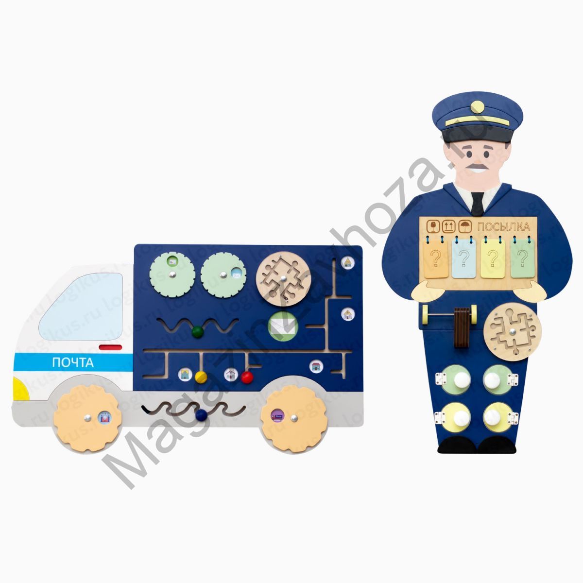 Производитель: Логикус, сделано в России. Артикул: 100.28 Размеры (ВхШ): Бизиборд "Почтовый фургон" 76 х 46 см. Бизиборд "Почтальон" 75 х 40 см., Вес в упаковке: 6,3 кг,объем в упаковке: 0,05 м3. Материал: фанера высшего сорта (I/II), МДФ, гипоаллергенное лакокрасочное покрытие, латексная печать. Возраст: от 3 до 7 лет. Состав комплекта: 1 х Бизиборд Почтальон 1 х Бизиборд Почтовый фургон Бизиборды вы можете приобрести по отдельности!