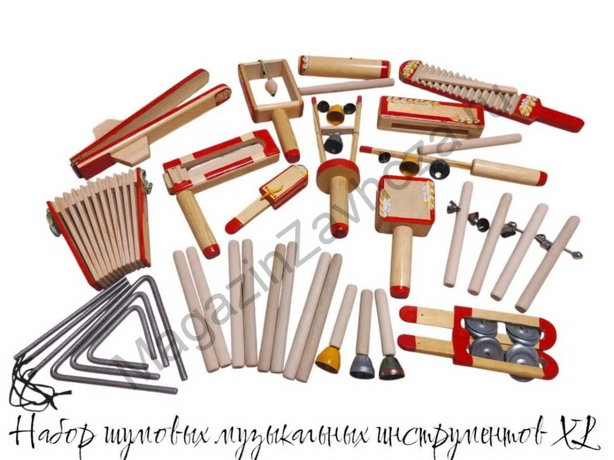 Состав набора: Трещотка Рубель + палочка Коробочка + палочка Бич-хлопушка Сорока Тамбурин + палочка Рогатка с колокольчиками Вертяшка Колотушка Удочка с колокольчиками Грематуха Клавесы 4 пары Клавесы с колокольчиками Клавесы с бубенчиками Джингл-стик 2 шт. Набор музыкальных колокольчиков на ручке Набор музыкальных треугольников 20, 15, 10 см. Музыкальное приложение.