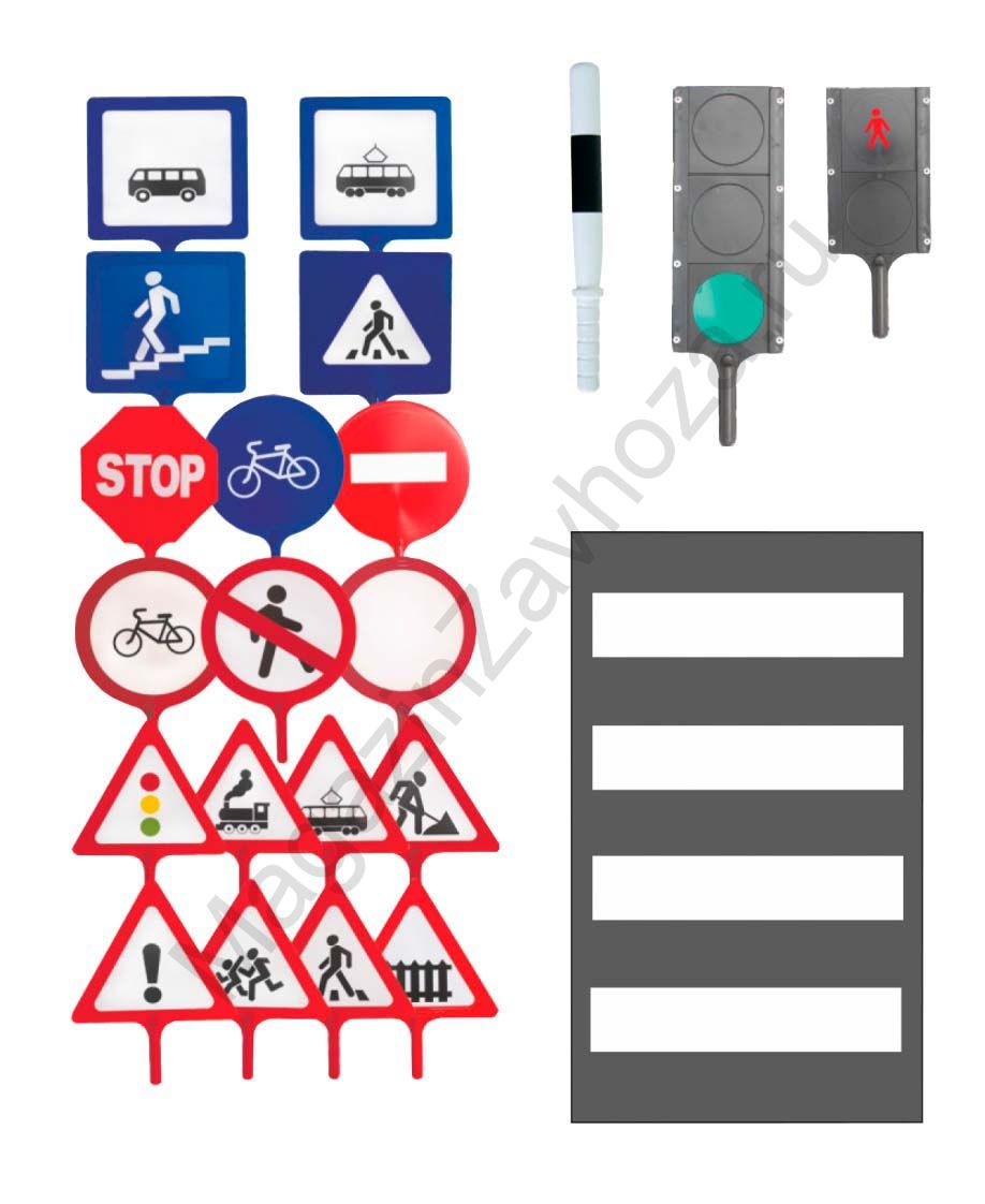 Размер(см): 39*10*27. Набор знаков дорожного движения включает: дорожный знак с ручкой - 18 шт. (8 шт - 245х310 мм., 10 шт - 245х340 мм.) светофор - 2 шт. (125х400 мм и 125х300 мм.) пешеходная дорожка - 1 шт. (600х900 мм.) жезл регулировщика - 1 шт.