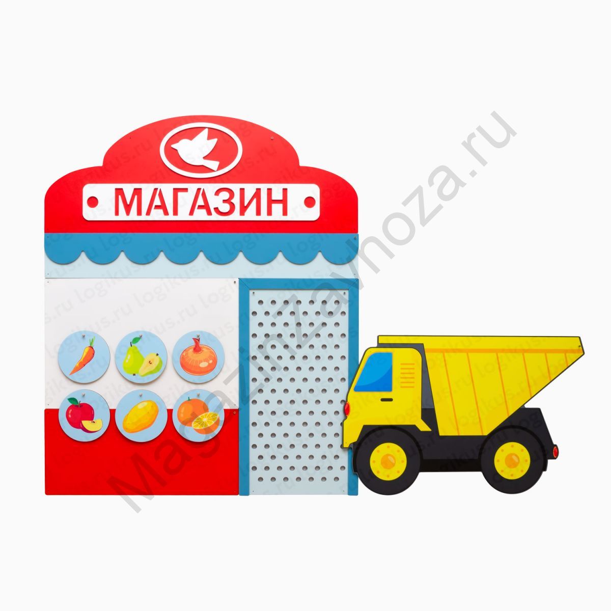 Производитель: Логикус, сделано в России. Артикул: 400.48 Размер (ВхШ): "Магазин" - 144 х 120 см., "Самосвал" - 60 х 94 см. Вес в упаковке: 15,1 кг, объем в упаковке: 0,07 м3. Материал: МДФ, фанера высшего сорта, гипоаллергенное лакокрасочное покрытие.