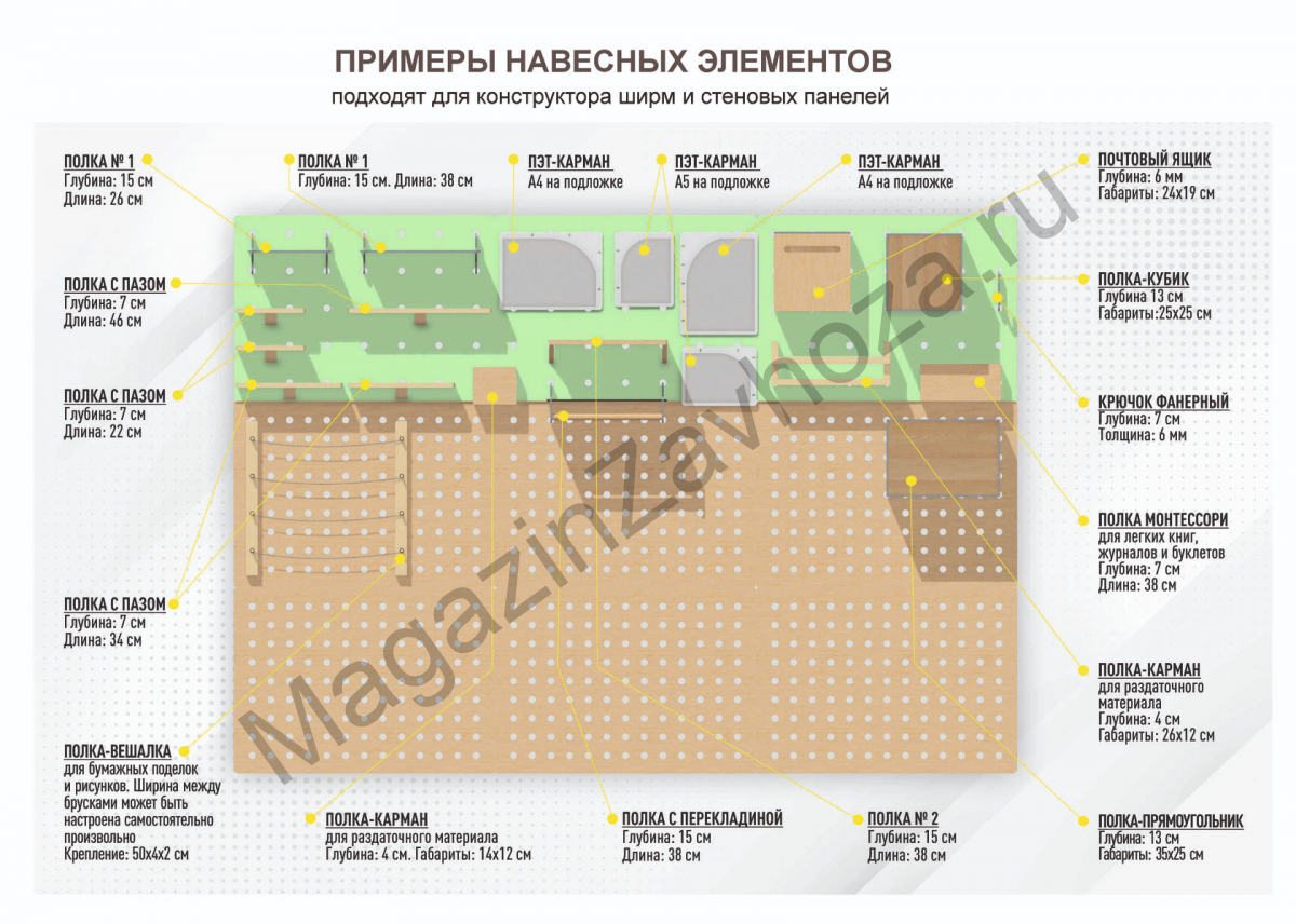 Стеновая панель ПС84ф Размер 840х600 мм. Материал: МДФ, покрытие: акриловая краска и лак на водной основе. Создайте уникальные игровые и информационные стены в детском саду с нашей новой концепцией - стеновые панели! Наш продукт не просто настенные панели, это целая система, которая позволит вам создавать удивительные игровые и образовательные пространства для детей. Все детали наших стеновых панелей полностью стандартизированы, что обеспечивает легкость и удобство в сборке. Настенные панели для детского сада предлагаем в мягких пастельных оттенках, чтобы они служили базой для ярких игровых навесных элементов и не перетягивали на себя внимание детей. Настенная панель способна превратиться в дидактическую панель и открыть перед детьми широкие возможности для обучения и развития. С помощью дополнительных навесных элементов, которые легко прикрепить к панелям, вы сможете создавать разнообразные уголки, способствующие развитию интеллектуальных и познавательных навыков у детей. Примеры навесных элементов можно посмотреть на фото: - Полки - Полки с пазом - Полка-карман - Полка-вешалка - Полка с перекладиной - Полка прямоугольник - Полка Монтессори - Полка-кубик - Почтовый ящик - Пэт-карманы - Крючки и др. Вы сможете легко собрать и разобрать игровую стену, а также перемещать элементы их по вашему усмотрению. Это дает вам возможность быстро изменить конфигурацию игрового пространства и адаптировать его под различные возрастные группы детей. Наша библиотека навесных тематических элементов постоянно разрабатывается и пополняется, так что у вас всегда будет большой выбор. Формируйте свои наборы игровых настенных перфорированных панелей с необходимым ассортиментом и количеством навесных элементов. Вы можете выбрать те элементы, которые подходят именно для вашего детского сада и создать уникальное игровое пространство. Наши панели покрыты акриловой краской и лаком, и доступны в различных цветах. Кроме того, вы можете окрасить и декорировать их по своему вкусу, чтобы они идеально сочетались с интерьером вашего детского сада. Но наши стеновые панели не только для игры. Они также могут быть использованы для организации информационных стендов и систем хранения. Вы сможете легко навешивать готовые пэт-карманы, полки нужного размера и другие декоративные элементы на панели. Например, вы сможете создать уникальную и привлекательную выставочную зону, где будут представлены работы детей. При покупке наших панелей вы также получаете приятный бонус - экономию на ремонте стен в детском саду. Организуйте удобное для вас и детей пространство, которое будет идеально подходить для игровых, образовательных и бытовых целей. Стеновые игровые панели от ТМ Рыжий Тим - это прекрасное решение для вашего детского сада! Позвоните! Мы дадим вам полную консультацию Кроме того, СТЕНОВЫЕ ПАНЕЛИ, выполнены по единому стандарту с КОНСТРУКТОРОМ ИГРОВЫХ ШИРМ, являются логичным его продолжением и помогут вам создать уникальное игровое пространство в детском саду. Расположите игровые модули в ростовой зоне ребенка, чтобы он мог играть комфортно и безопасно. Вы можете легко переносить игровые зоны с ширмы на стену и наоборот. Это даст вам возможность создавать разнообразные игровые сценарии и менять их по своему усмотрению. Играйте на ширме или на стене - выб