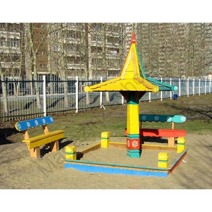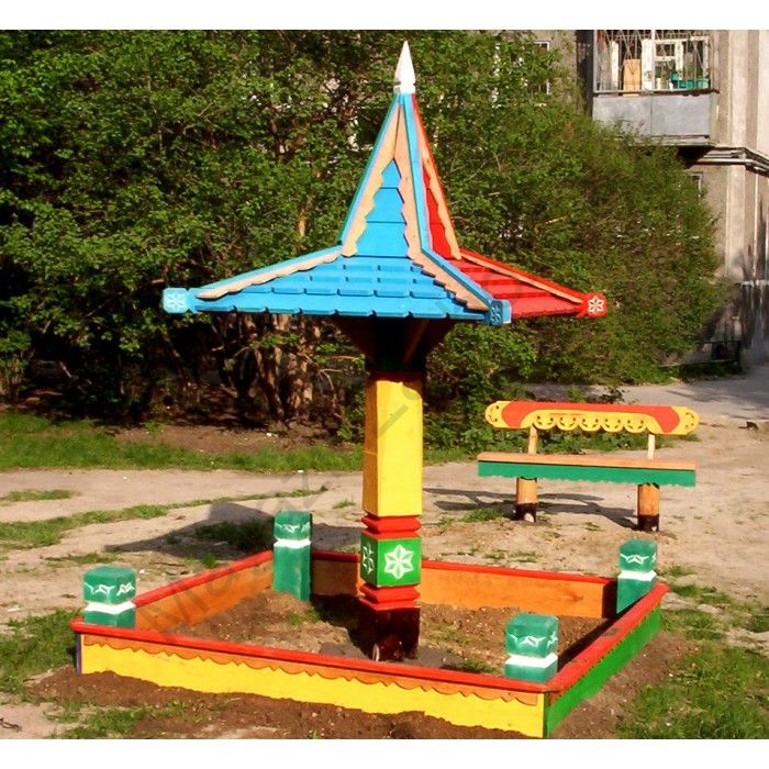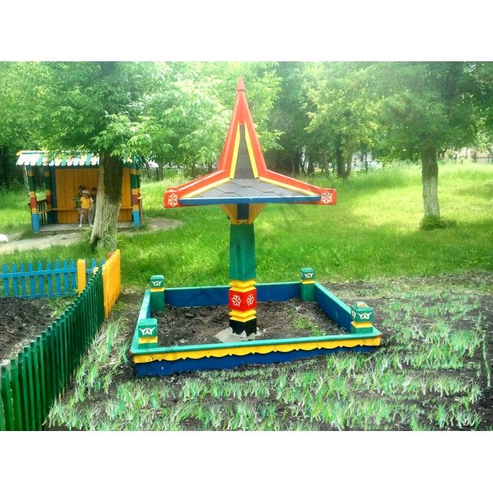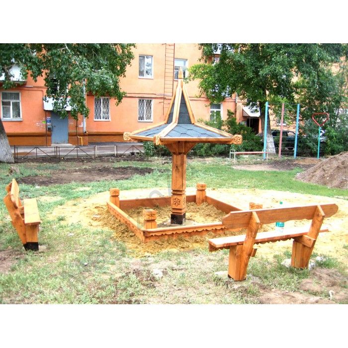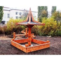 Песочная коробка 2000*2000  мм. высотой 300 мм крепится на четырёх столбиках из бруса 150*150 мм.