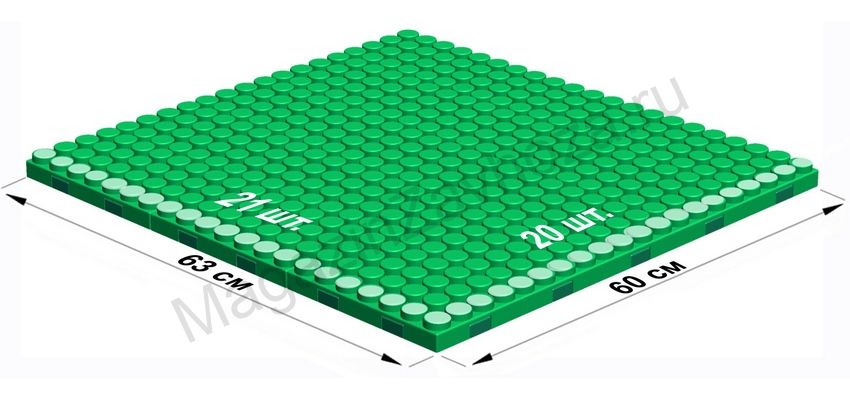 Платформа состоит из элементов 12 х 21 см, соединяемых между собой специальными соединительными элементами, по периметру платформы использованы заглушающие элементы. -- 15 блоков. Элемент платформы GigaBloks 5" 7 х 4 зеленый -- 15 шт. Соединительный элемент платформы GigaBloks 5" 7 х 4 зеленый -- 34 шт. Заглушающий элемент платформы GigaBloks 5" 7 х 4 зеленый -- 22 шт. Вес -- 2,5 кг. Объем -- 0,021.