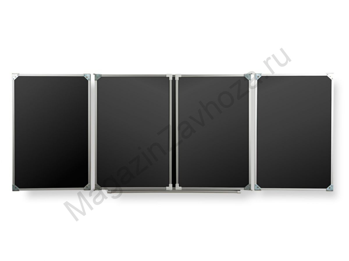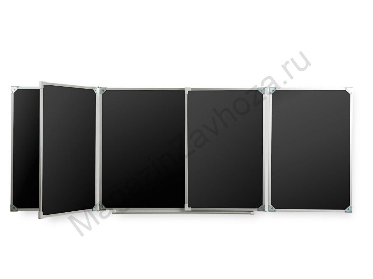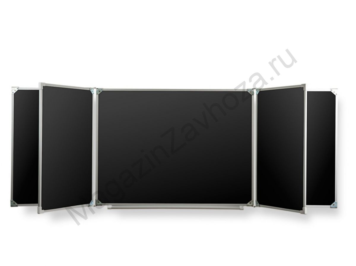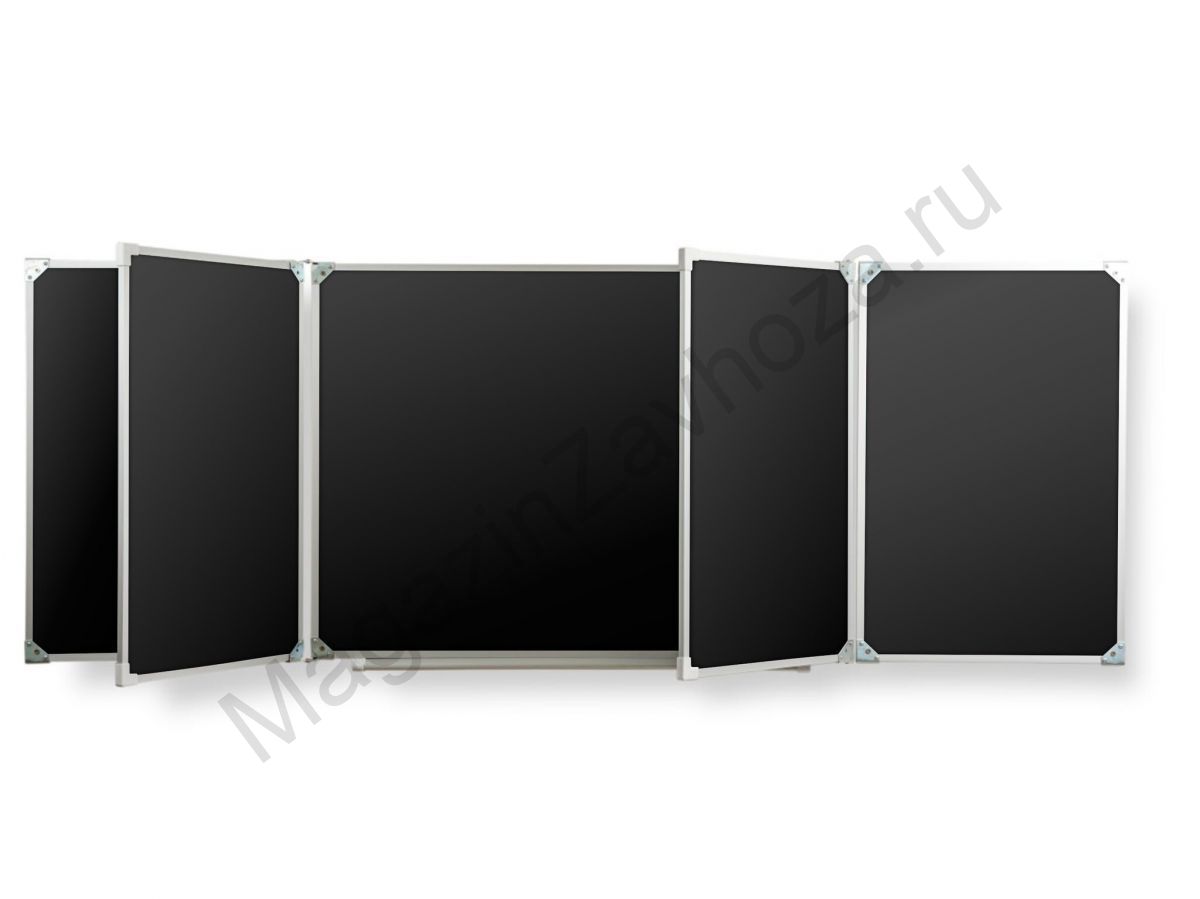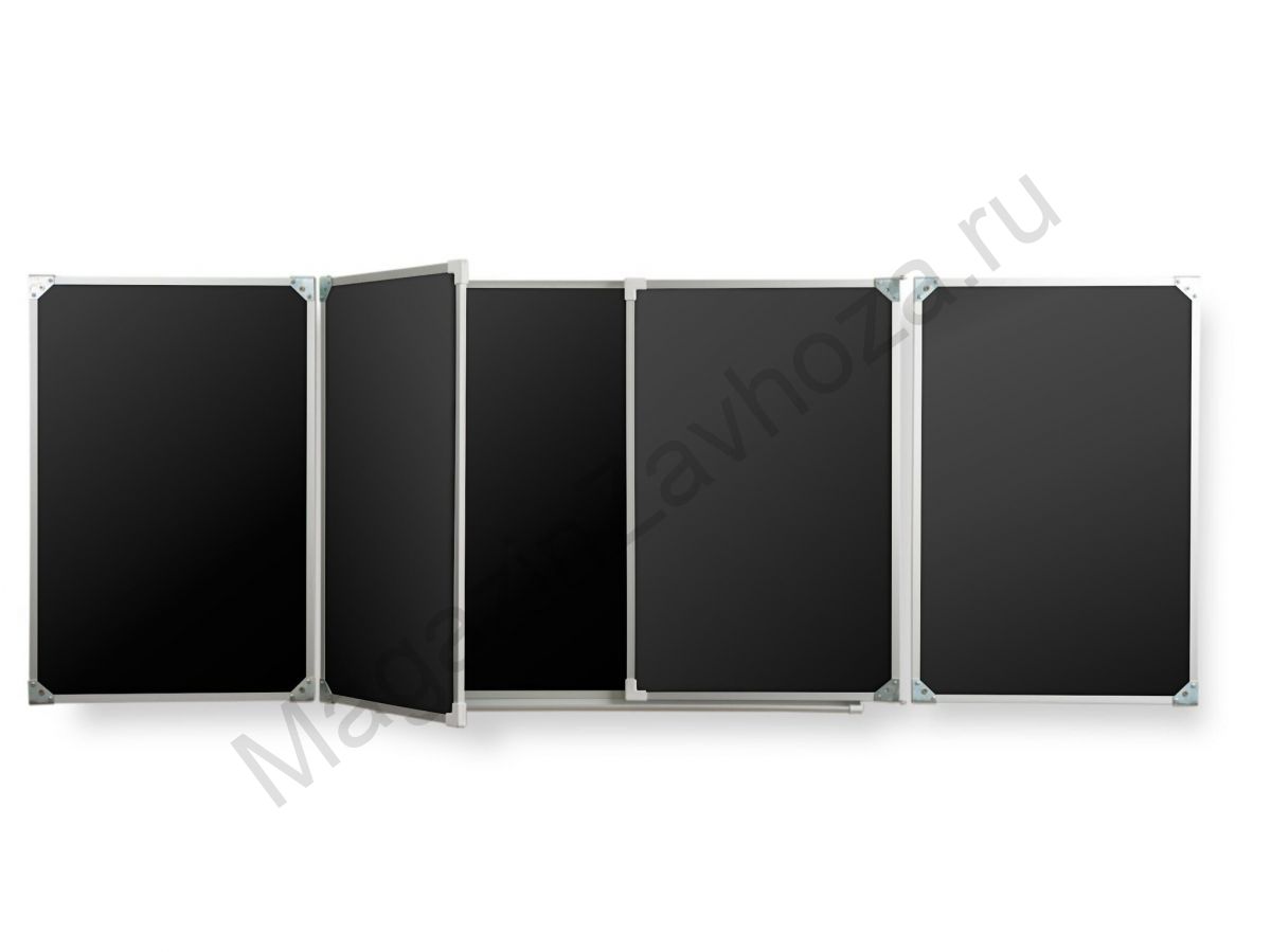 Рабочая поверхность изготовлена из стального полимерного листа высочайшего качества, обрамление — высокопрочный алюминиевый профиль, благодаря чему доска имеет высокую износоустойчивость, прочность и надежность конструкции.  1-й элемент это центральная часть школьной доски, которая крепится к стене, а створки (2-й и 3-й элементы), могут независимо открываться и закрываться от плоскости центральной части доски до плоскости стены. Также есть статичные 4 и 5 элементные. Они могут быть как для мела, так и для маркера. Петли многоэлементных досок рассчитаны на нагрузку свыше 100 кг.  Имеется лоток для мела/маркера и принадлежностей.