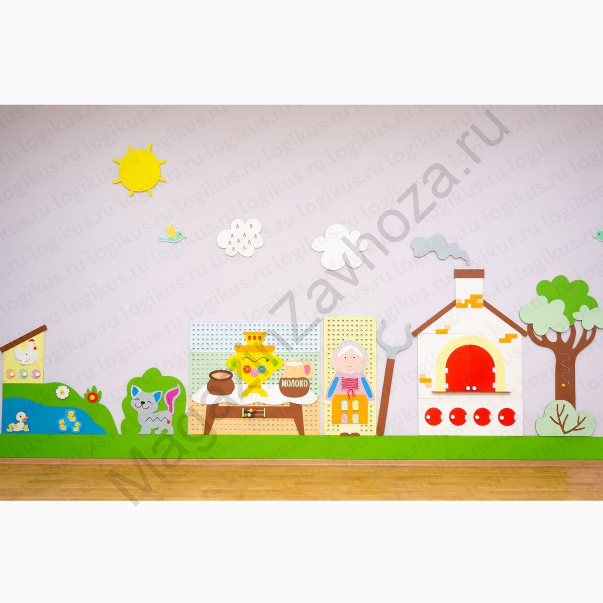 Совершите поездку в деревню не выходя из детского сада! Декоративно-развивающая панель из серии "Лето в деревне" - о самой доброй бабушке, которая всегда радушно встретит в деревне! Деревенский быт знаком далеко не всем детям, выросшим в городе, но это наследие нашей культуры. Откуда берется молоко, как выглядит русская печь и как раньше пекли пироги, что такое ухват - дошкольников ждет множество открытий! Панель из серии "Лето в деревне" - это не просто красивое оформление, это развивающая среда, которая побуждает задавать вопросы и искать на них ответы! Сюжетные настенные панели можно использовать: для занятий с педагогом по развитию речи, для ролевых игр, для самостоятельных игр детей 3-7 лет.