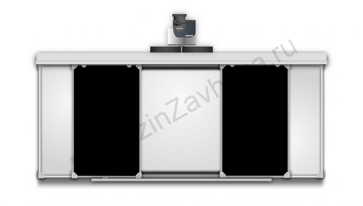 Слева и справа от интерактивной доски стационарно в стену крепятся две аудиторные доски. Еще две аудиторные доски крепятся в направляющий верхний профиль через систему кареток и имеют свободный ход.