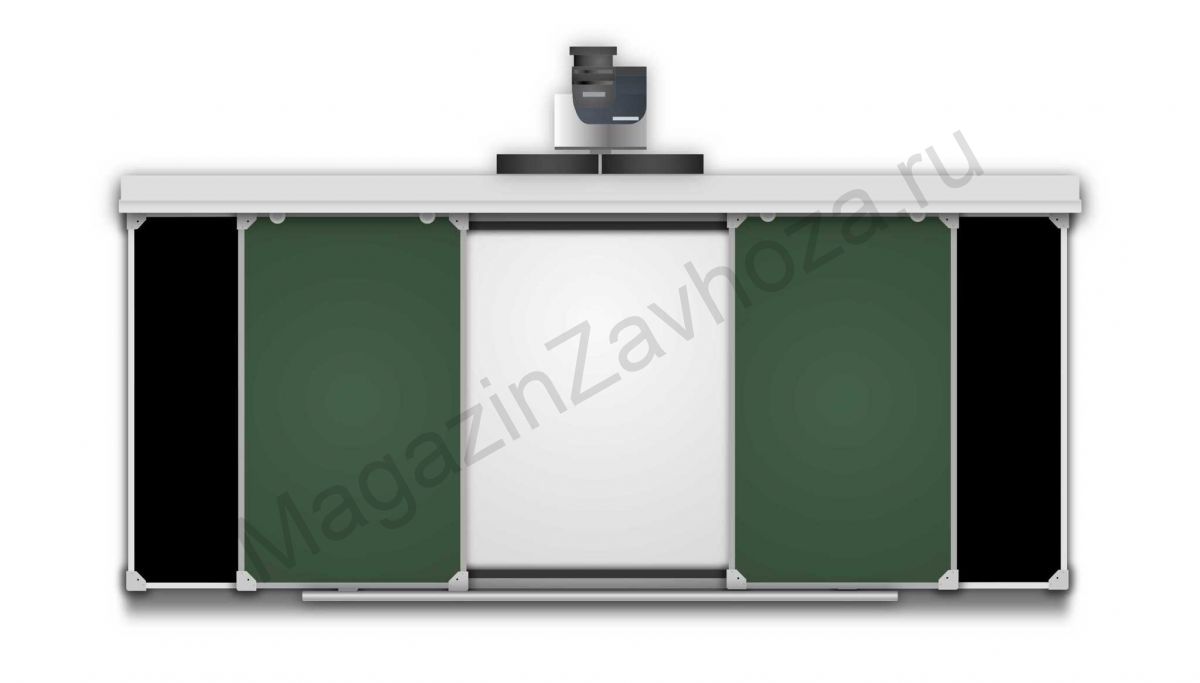 Функционально состоит из 4-х поверхностей для писания мелом, две из которых свободно перемещаются по рельсовой системе, закрывая интерактивную доску, встроенную в центр рельсовой системы.