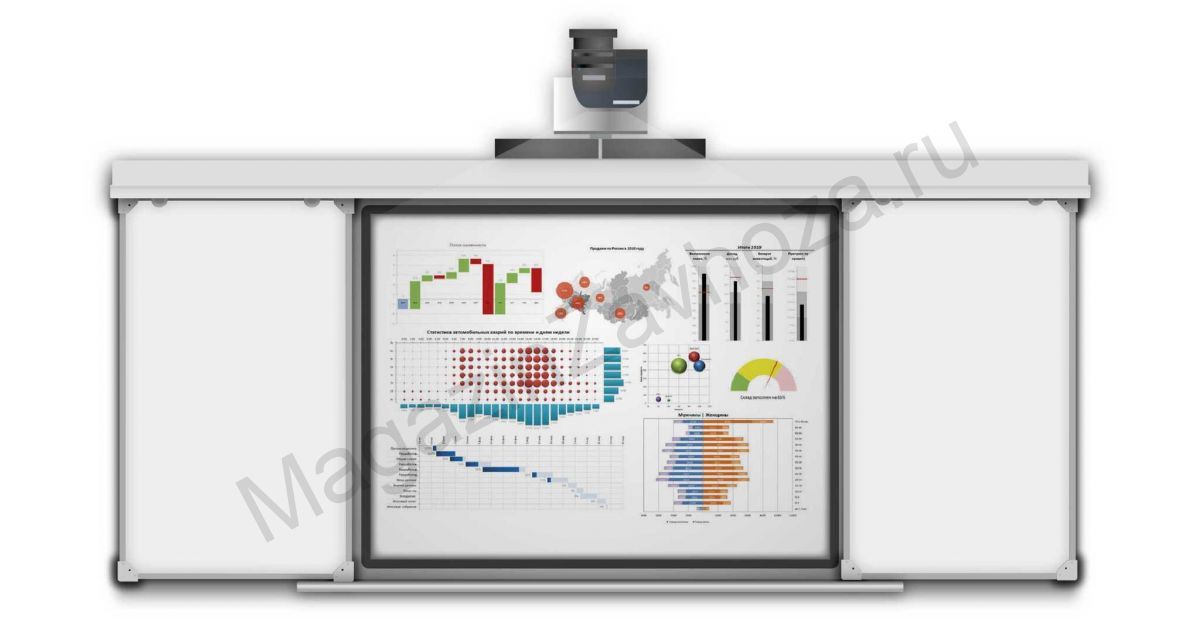Функционально состоит из 4-х поверхностей для писания маркером, две из которых свободно перемещаются по рельсовой системе, закрывая интерактивную доску или панель , встроенную в центр рельсовой системы.