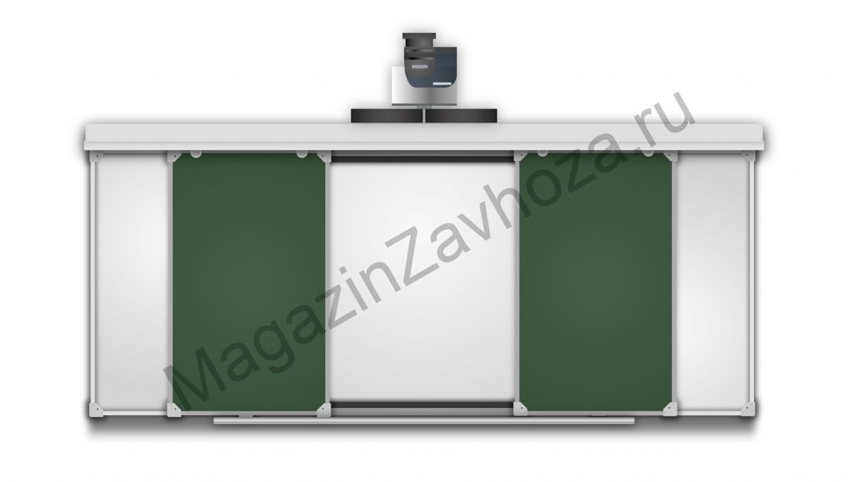 Функционально состоит из 4-х поверхностей (для писания мелом, либо маркером), две из которых свободно перемещаются по рельсовой системе, закрывая интерактивную доску или панель, встроенную в центр рельсовой системы.