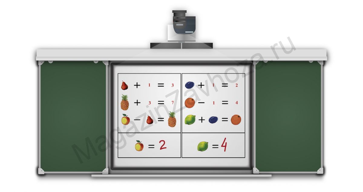Функционально состоит из 4-х поверхностей для писания мелом, две из которых свободно перемещаются по рельсовой системе, закрывая интерактивную доску или панель, встроенную в центр рельсовой системы.