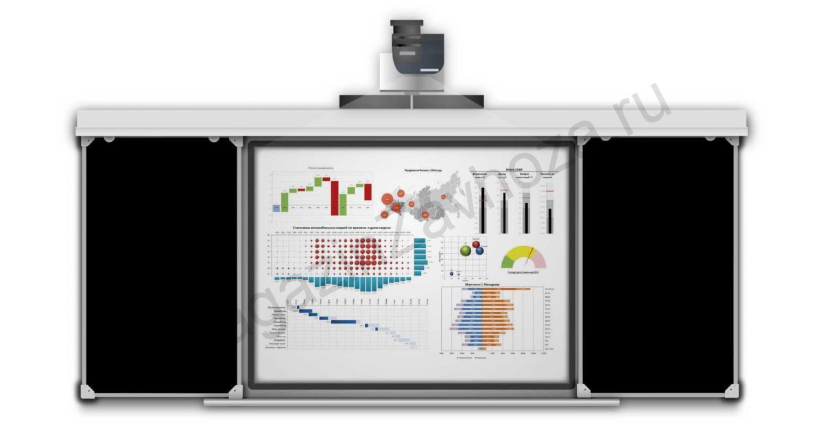 Функционально состоит из 4-х поверхностей для писания мелом, две из которых свободно перемещаются по рельсовой системе, закрывая интерактивную доску или панель, встроенную в центр рельсовой системы.