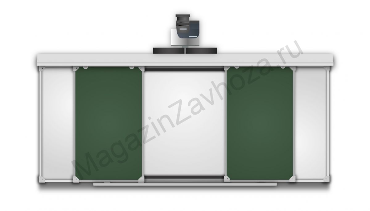 Функционально состоит из 4-х поверхностей (для писания мелом, либо маркером), две из которых свободно перемещаются по рельсовой системе, закрывая интерактивную доску или панель, встроенную в центр рельсовой системы.