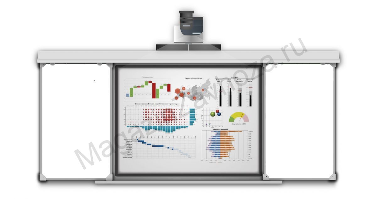 Функционально состоит из 4-х поверхностей для писания маркером, две из которых свободно перемещаются по рельсовой системе, закрывая интерактивную доску, встроенную в центр рельсовой системы.