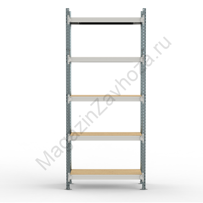 • Среднегрузовой стеллаж SGR-V-ДСП состоит из рам (сборная конструкция из двух оцинкованных стоек, соединенных горизонтальными и наклонными стяжками), продольных балок с креплением к стойкам на зацепах и настилов из ДСП, размещенных на продольных балках • Технология крепления балки к стойкам - безболтовая, на зацепах. Такой подход значительно уменьшает время сборки и установки стеллажа. Конструкция позволяет менять положение полок без демонтажа всей секции. • Ярус хранения включает в себя две продольные балки, соединенные между собой поперечными балками и настил из ДСП. • К раме стеллажа можно присоединить дополнительные секции на зацеп. Нагрузочные характеристики при добавлении доп.секций сохраняются • Допустимое минимальное количество ярусов хранения на каждую секцию - не менее трёх штук. • Для предотвращения случайного съёма балок яруса с рам предусмотрен фиксатор, устанавливаемый в конце сборки в прямоугольное отверстие каждого зацепа. • Каждая стойка снабжена металлическим подпятником на болтовом креплении. • Стеллаж комплектуется необходимой фурнитурой для сборки. • Стойки окрашены полимерной (порошковой) краской RAL 5015 синего цвета или RAL7035 светло-серого цвета, балки окрашены в RAL7035 светло-серого цвета.