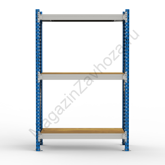 • Среднегрузовой стеллаж SGR-V-ДСП состоит из рам (сборная конструкция из двух стоек, соединенных горизонтальными и наклонными стяжками), продольных балок с креплением к стойкам на зацепах и настилов из ДСП, размещенных на продольных балках • Технология крепления балки к стойкам - безболтовая, на зацепах. Такой подход значительно уменьшает время сборки и установки стеллажа. Конструкция позволяет менять положение полок без демонтажа всей секции. • Ярус хранения включает в себя две продольные балки, соединенные между собой поперечными балками и настил из ДСП. • К раме стеллажа можно присоединить дополнительные секции на зацеп. Нагрузочные характеристики при добавлении доп.секций сохраняются • Допустимое минимальное количество ярусов хранения на каждую секцию - не менее трёх штук. • Для предотвращения случайного съёма балок яруса с рам предусмотрен фиксатор, устанавливаемый в конце сборки в прямоугольное отверстие каждого зацепа. • Каждая стойка снабжена металлическим подпятником на болтовом креплении. • Стеллаж комплектуется необходимой фурнитурой для сборки. • Стойки окрашены полимерной (порошковой) краской RAL 5015 синего цвета или RAL7035 светло-серого цвета, балки окрашены в RAL7035 светло-серого цвета.