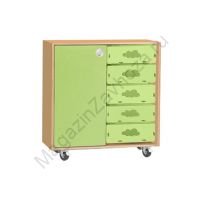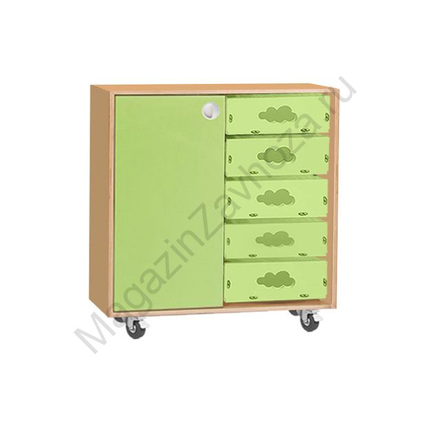 ЛДСП Корпус БУК , фасады и задник ЛАЙМ Размеры:650х450х1000мм Вес:35кг Объём:0,07м/куб Контейнер ПВХ:300х420х100мм - 5шт. Установлены усиленные поворотные прорезиненные колеса. 2 из них со стопором (тормозом).