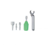 Набор состоит из: 4 сменных насадок- 3 в виде отверток с различными шлицами, одна в виде головки гаечного ключа, 1 рожковый гаечный ключ, ручка для насадок для ручной работы. Цвет насадок серый, цвет ручки зеленый. Детали изготовлены из атмосферостойких материалов, подходит для внутреннего и наружного использования.