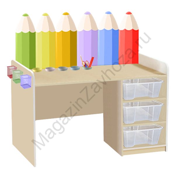 ЛДСП бук или цветное. Кромка ПВХ. Декор МДФ, краска "Тиккурила" Размеры:890х500х580-640мм Вес:23кг Объём:0,1м/куб 6 врезных стаканов. 3 подвесных контейнера на перфорации. Контейнер ПВХ:300х420х100мм - 2шт. Контейнер ПВХ:300х420х230мм - 1шт. выдвижные на алюминиевых полозках.