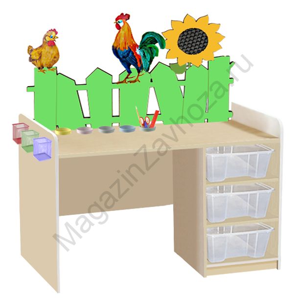 ЛДСП бук или цветное. Кромка ПВХ. Декор МДФ, краска "Тиккурила" Размеры:890х500х580-640мм Вес:23кг Объём:0,1м/куб 6 врезных стаканов. 3 подвесных контейнера. Контейнер ПВХ - 3шт.