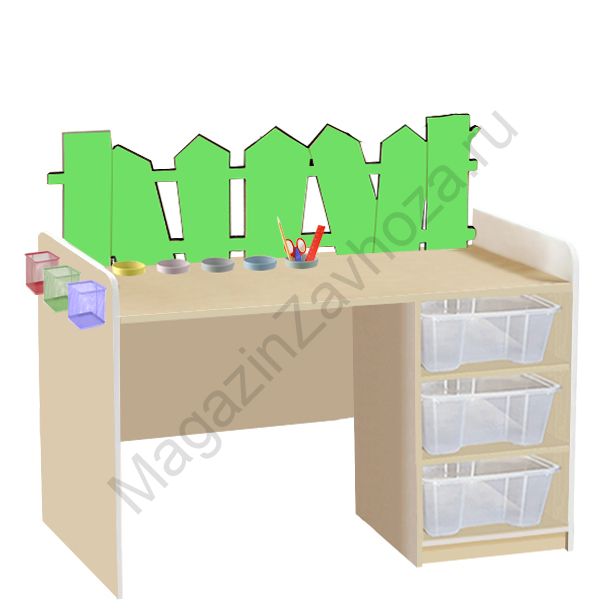 ЛДСП бук или цветное. Кромка ПВХ. Декор МДФ, краска "Тиккурила" Размеры:890х500х580-640мм Вес:23кг Объём:0,1м/куб 6 врезных стаканов. 3 подвесных контейнера. Контейнер ПВХ - 3шт.