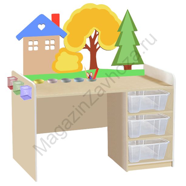 ЛДСП бук или цветное. Кромка ПВХ. Декор МДФ, краска "Тиккурила" Размеры:890х500х580-640мм Вес:23кг Объём:0,1м/куб 6 врезных стаканов. 3 подвесных контейнера. Контейнер ПВХ - 3шт.