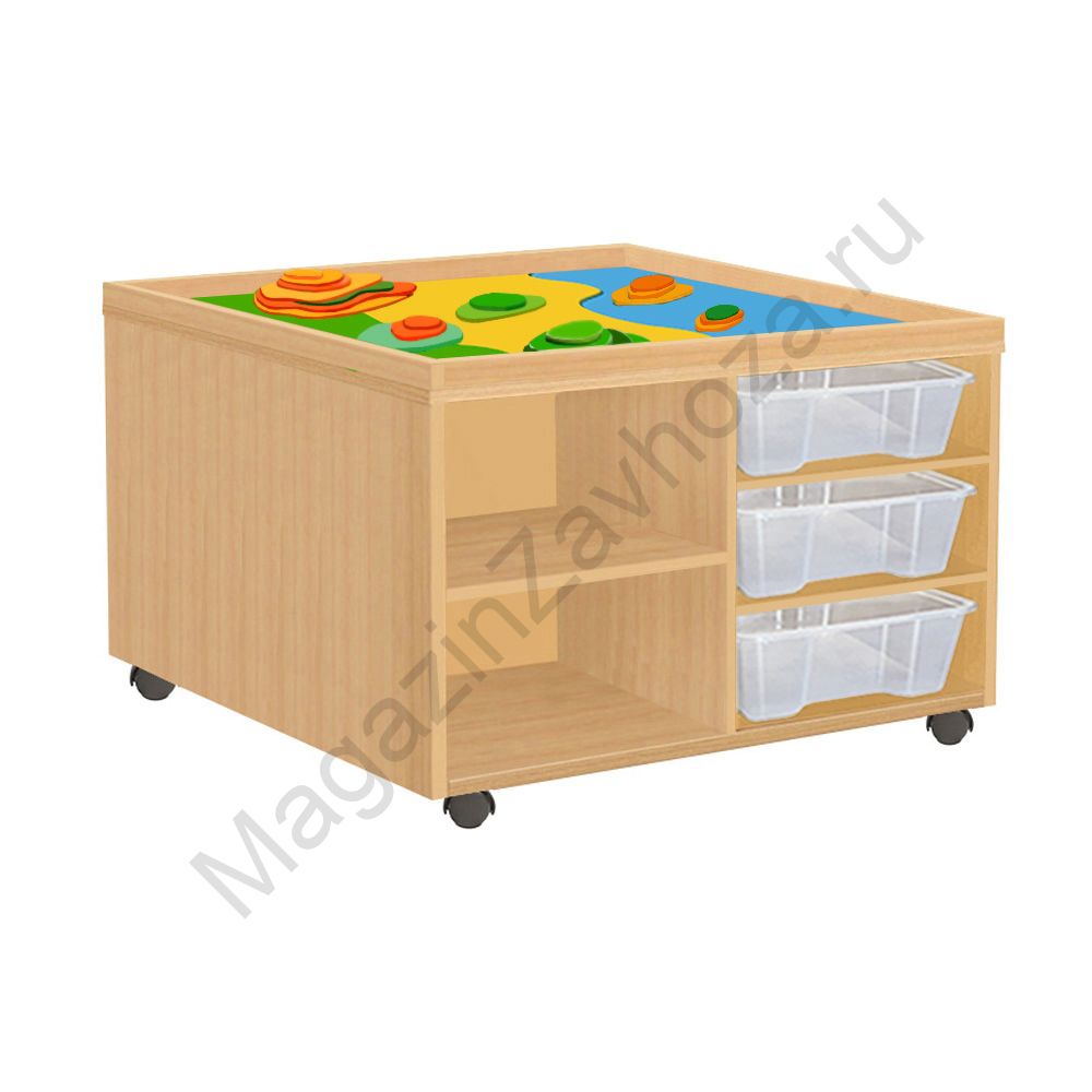 Из ЛДСП Бук или Цветного Кромка ПВХ. Размеры:888х600х580мм Вес:45кг Объём:0,15м/куб Контейнер ПВХ:300х420х100мм - 6шт. 27 элементов ландшафта из фанеры. Установлены пластиковые или усиленные поворотные прорезиненные колеса. 2 из них со стопором (тормозом).
