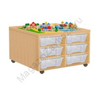Из ЛДСП Бук или Цветного Кромка ПВХ. Размеры:888х600х580мм Вес:48кг Объём:0,15м/куб Контейнер ПВХ:300х420х100мм - 12шт. 27 элементов ландшафта из фанеры. 143 фигурки городок/ферма/транспорт. Установлены пластиковые или усиленные поворотные прорезиненные колеса. 2 из них со стопором (тормозом).