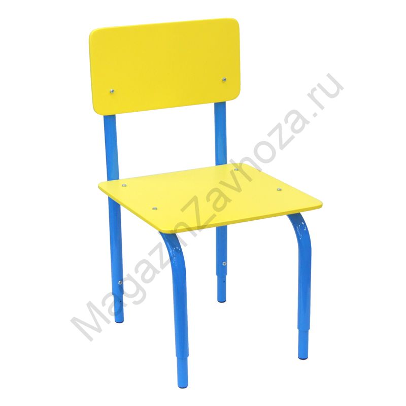 Изготовлен из трубы диаметром 22 и 18мм Сидение и спинка из МДФ 8 мм. Покрытие МДФ: краска "Тиккурила" ЖЁЛТАЯ Покрытие каркаса: полимер СИНИЙ Изменяемая высота: 220-260-300 , 260-300-340 , 300-340-380мм. Вес: 2.3 ; 2.5 ; 3 кг