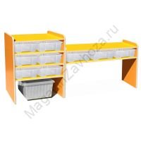Из ЛДСП Бук или Цветного Кромка ПВХ. Размеры:1600х420х900мм С приставным регулируемым по высоте столом от 400-640мм Вес:41кг Объём:0,2м/куб Контейнер ПВХ:420х300х100мм - 9шт. Ящик подкатной ПВХ:400х400х300мм -1 шт.
