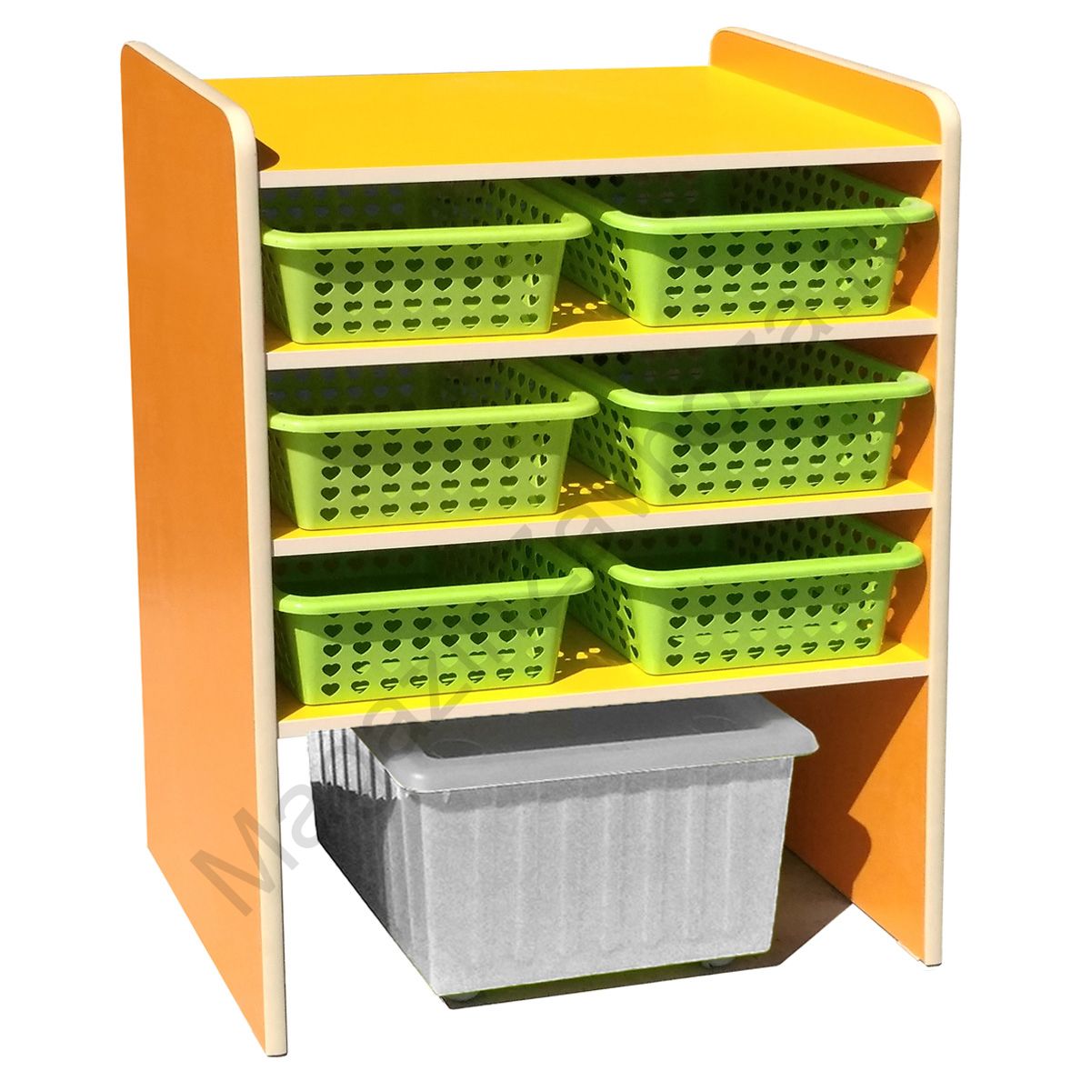 Из ЛДСП Бук или Цветного Кромка ПВХ. Размеры:650х420х900мм Вес:22кг Объём:0,15м/куб Корзина ПВХ:400х300х125мм - 6шт. Ящик подкатной ПВХ:400х400х300мм -1 шт.
