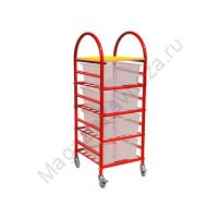 Из металлической трубы 22мм Покрытие: полимерно-порошковое Размеры:380х400х1040мм Установлены усиленные поворотные прорезиненные колеса. 2 из них со стопором (тормозом). Вес: 6 кг Объём:0,1м/куб. Контейнер ПВХ :395х295х140мм - 4шт.