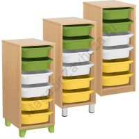 Из ЛДСП Бук или Цветного на цоколе р-ры:340х450х950мм На метел.ножках р-ры:340х450х990мм Вес:20кг Объём:0,065м/куб Контейнер ПВХ:300х420х100мм - 6шт. Крепёж к стене обязателен. Направляющий полозок алюминий.