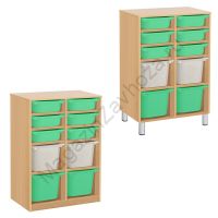 Из ЛДСП Бук или Цветного на цоколе р-ры: 650х450х1100мм На метел.ножках р-ры: 650х450х1140мм Вес:40кг Объём:0,13м/куб Контейнер ПВХ:300х420х100мм - 6шт. Контейнер ПВХ:300х420х230мм - 4шт. Крепёж к стене обязателен. Направляющий полозок алюминий.