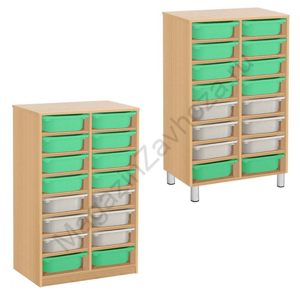 Из ЛДСП Бук или Цветного на цоколе р-ры: 650х450х1250мм На метел.ножках р-ры: 650х450х1290мм Вес:45кг Объём:0,15м/куб Контейнер ПВХ:300х420х100мм - 16шт. Крепёж к стене обязателен. Направляющий полозок алюминий.