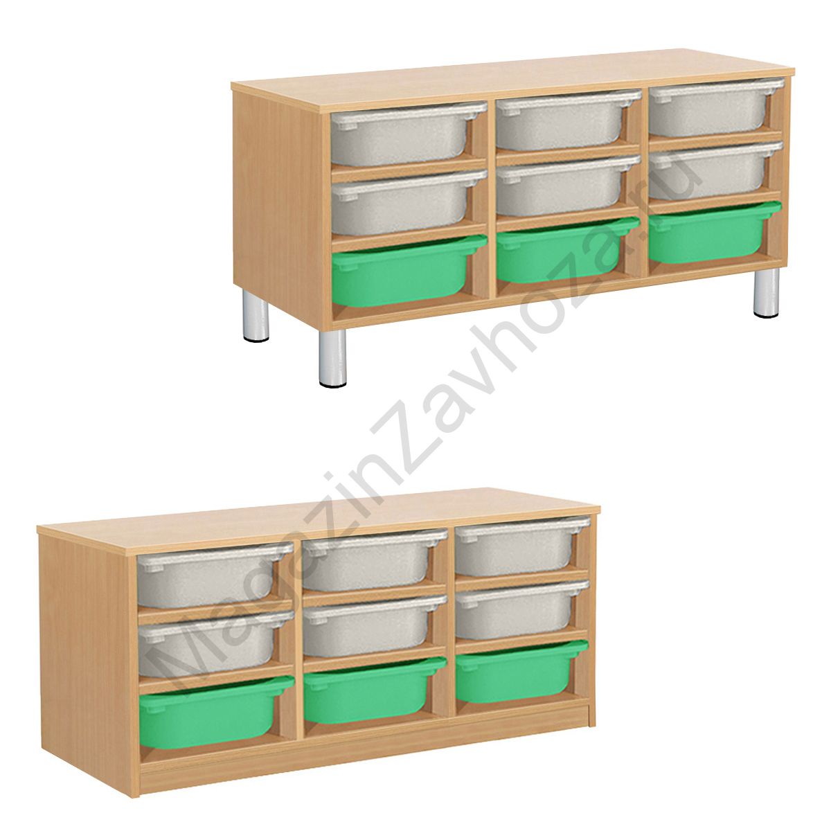 Из ЛДСП Бук или Цветного на цоколе р-ры: 976х450х500мм На метел.ножках р-ры: 976х450х540мм Вес:31кг Объём:0,09м/куб Контейнер ПВХ:300х420х100мм - 9шт. Направляющий полозок алюминий.
