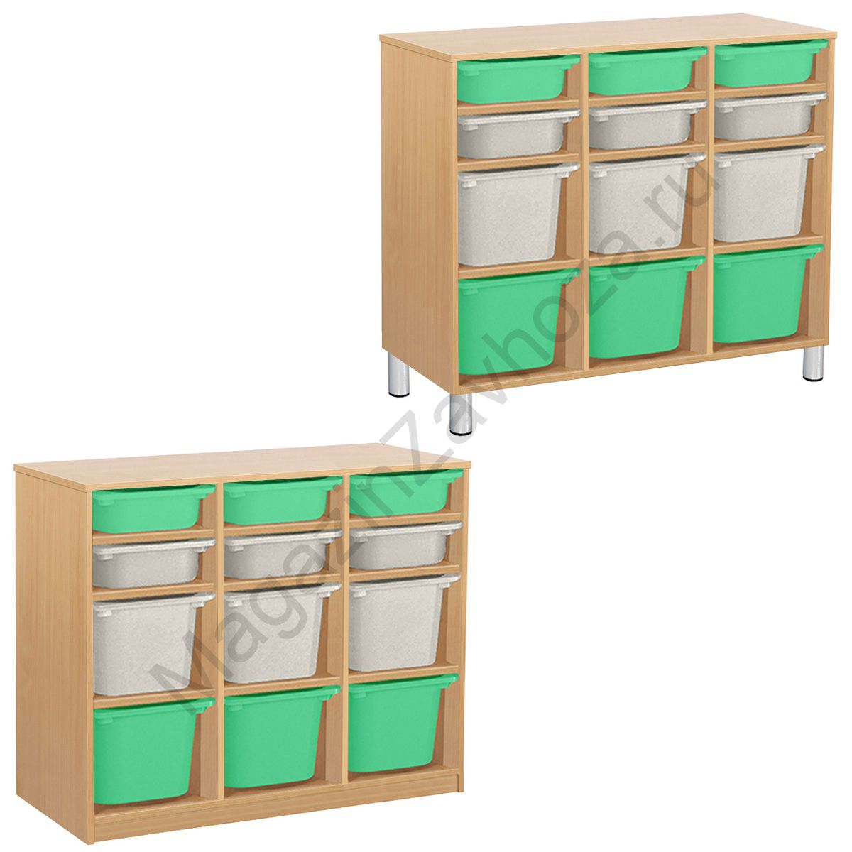 Из ЛДСП Бук или Цветного на цоколе р-ры: 976х450х950мм На метел.ножках р-ры: 976х450х990мм Вес:50кг Объём:0,17м/куб Контейнер ПВХ:300х420х100мм - 6шт. Контейнер ПВХ:300х420х230мм - 6шт. Крепёж к стене обязателен. Направляющий полозок алюминий.