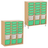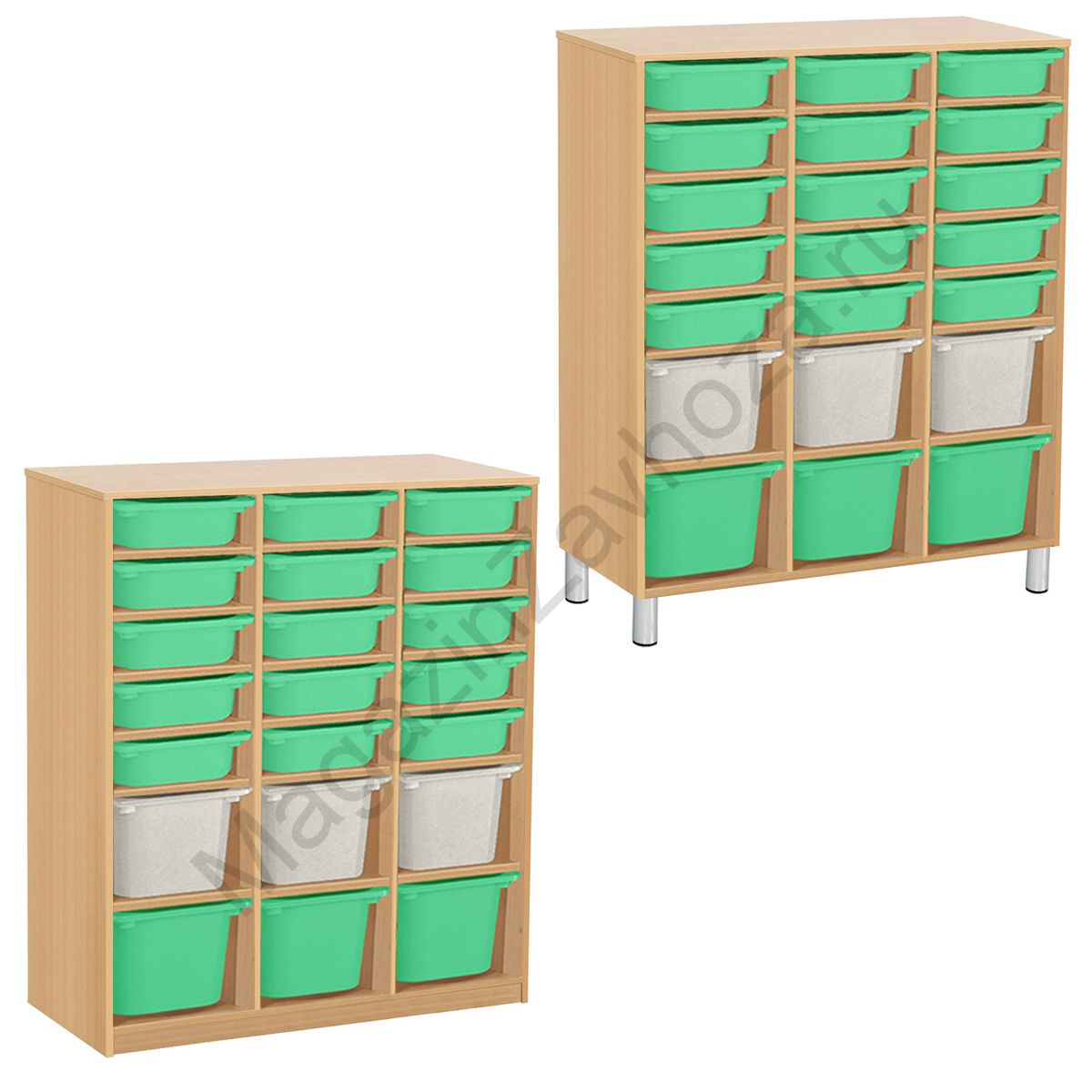 Из ЛДСП Бук или Цветного на цоколе р-ры: 976х450х1400мм На метел.ножках р-ры: 976х450х1440мм Вес:70кг Объём:0,2м/куб Контейнер ПВХ:300х420х100мм - 15шт. Контейнер ПВХ:300х420х230мм - 6шт. Крепёж к стене обязателен. Направляющий полозок алюминий.