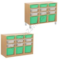 Из ЛДСП Бук или Цветного на цоколе р-ры: 976х450х800мм На метел.ножках р-ры: 976х450х840мм Вес:44кг Объём:0,15м/куб Контейнер ПВХ:300х420х100мм - 9шт. Контейнер ПВХ:300х420х230мм - 3шт. Крепёж к стене обязателен. Направляющий полозок алюминий.