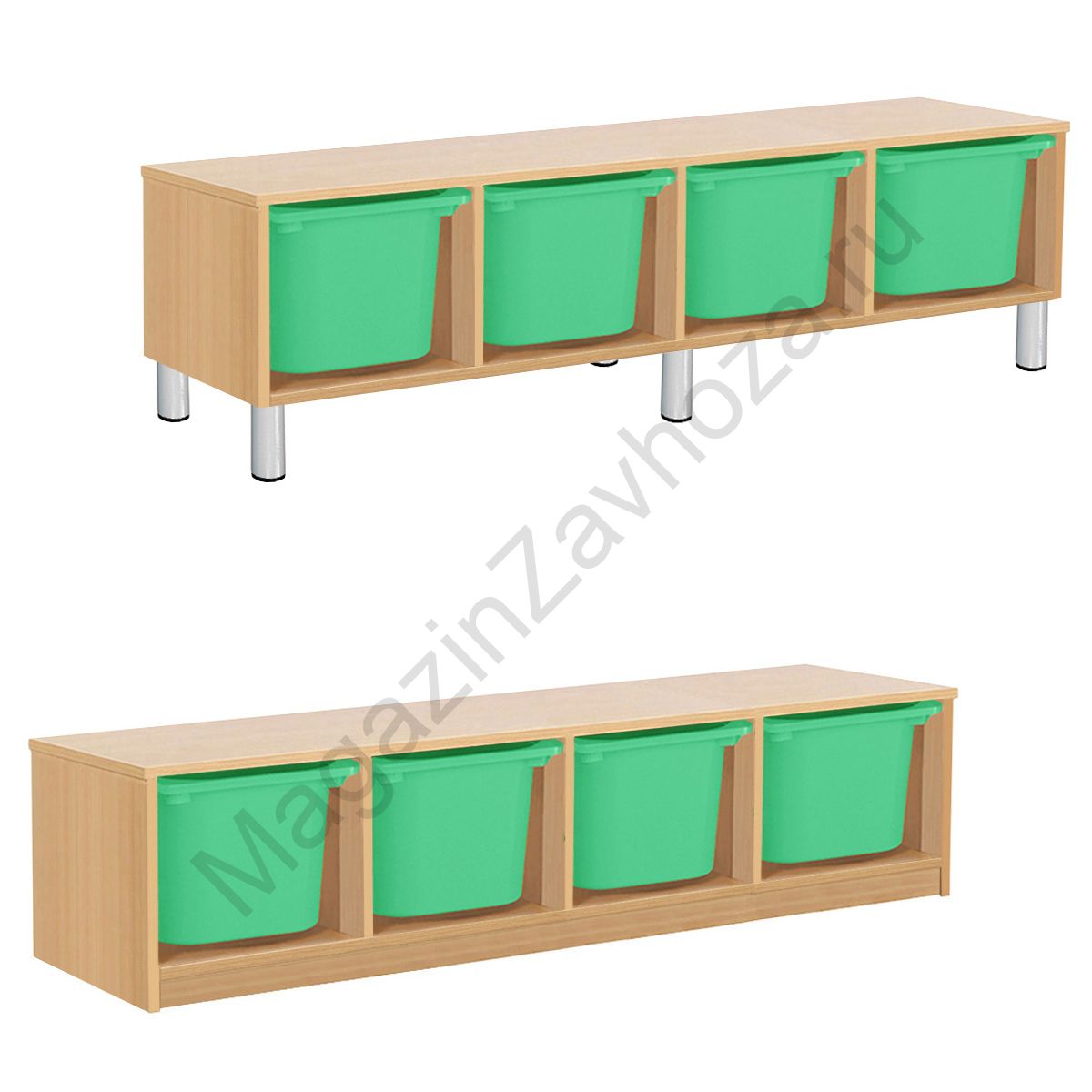 Из ЛДСП Бук или Цветного на цоколе р-ры: 1300х450х350мм На метел.ножках р-ры: 1300х450х390мм Вес:33кг Объём:0,08м/куб Контейнер ПВХ:300х420х230мм - 4шт. Направляющий полозок алюминий.