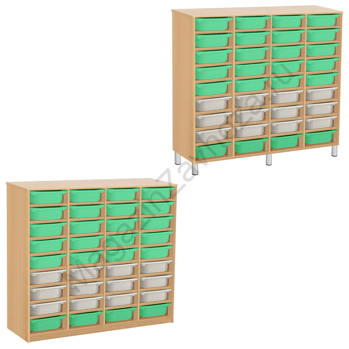 Из ЛДСП Бук или Цветного на цоколе р-ры: 1300х450х1400мм На метел.ножках р-ры: 1300х450х1440мм Вес:90кг Объём:0,3м/куб Контейнер ПВХ:300х420х100мм - 36шт. Крепёж к стене обязателен. Направляющий полозок алюминий.
