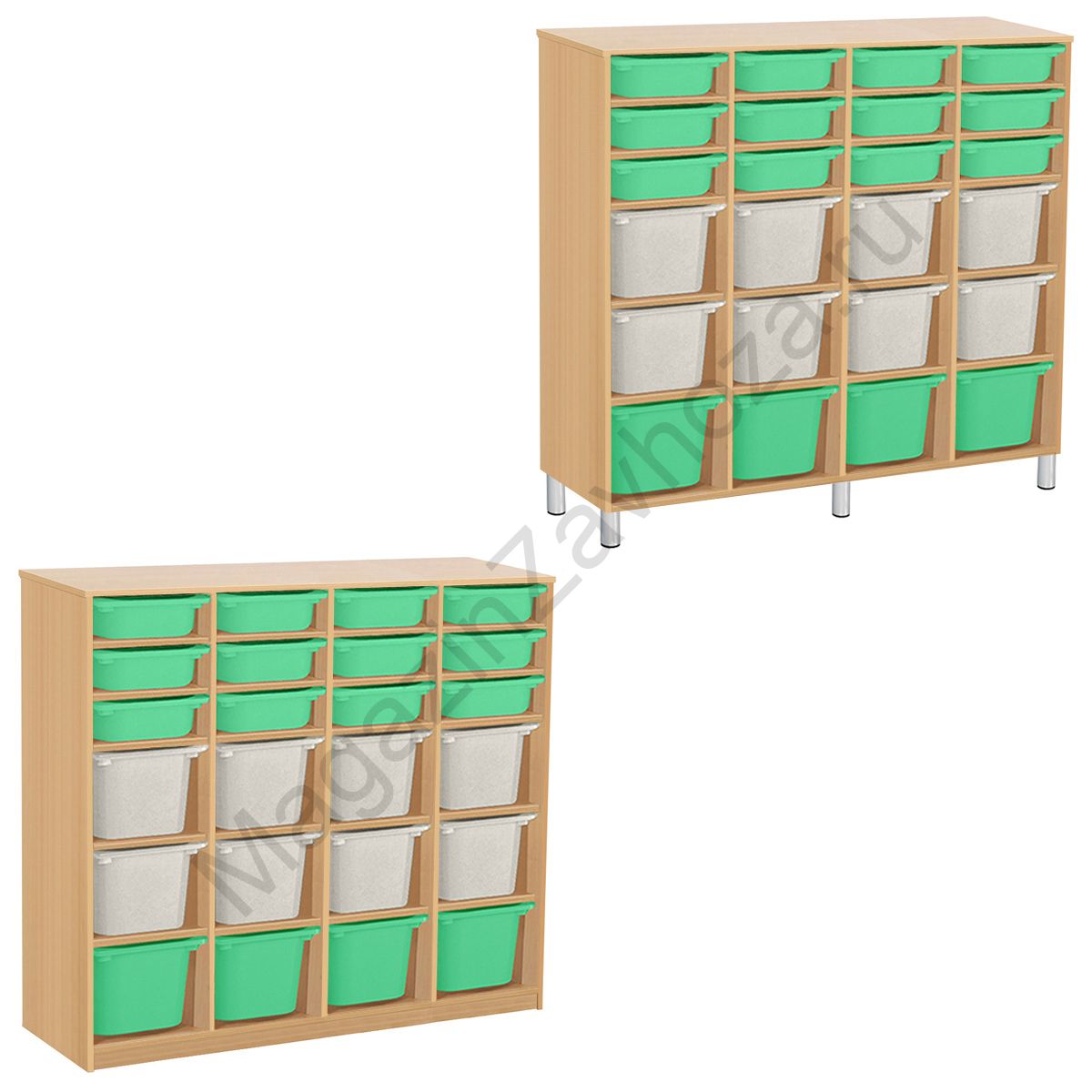 Из ЛДСП Бук или Цветного на цоколе р-ры: 1300х450х1400мм На метел.ножках р-ры: 1300х450х1440мм Вес:90кг Объём:0,3м/куб Контейнер ПВХ:300х420х100мм - 12шт. Контейнер ПВХ:300х420х230мм - 12шт. Крепёж к стене обязателен. Направляющий полозок алюминий.