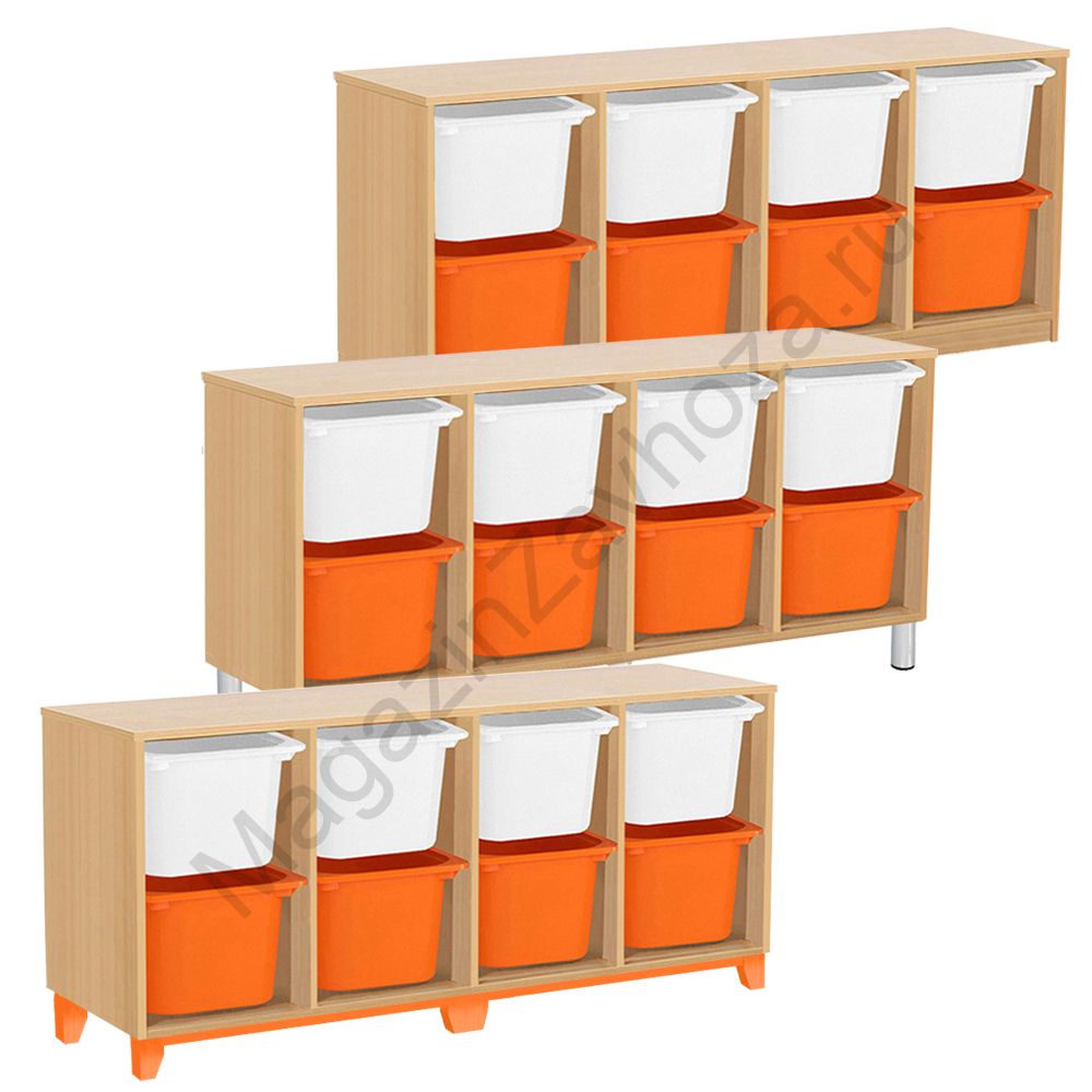 Из ЛДСП Бук или Цветного на цоколе р-ры: 1300х450х650мм На метел.ножках р-ры: 1300х450х690мм Вес:49кг Объём:0,11м/куб Контейнер ПВХ:300х420х230мм - 8шт. Направляющий полозок алюминий.