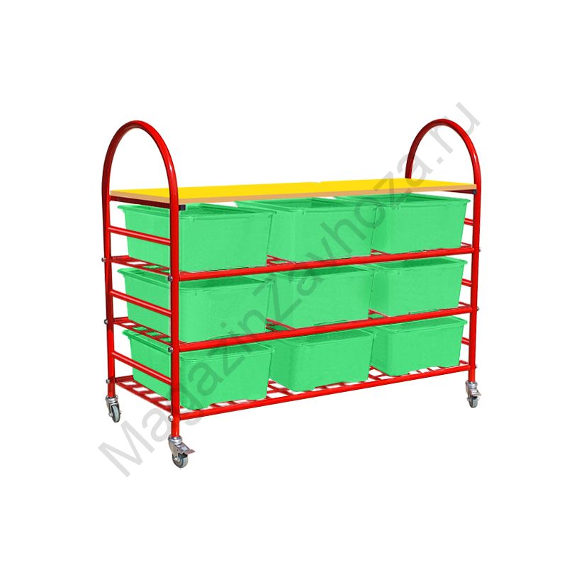 Из металлической трубы 22мм, 15х15мм Покрытие: полимерно-порошковое Размеры:1000х400х1050 Установлены усиленные поворотные прорезиненные колеса. 2 из них со стопором (тормозом). Вес: 12 кг Объём:0,3м/куб. Контейнер ПВХ:395х295х200мм - 9шт.