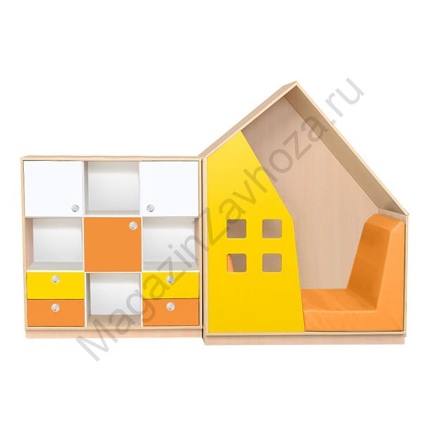 Корпус Из ЛДСП Бук, фрезерованные цветные фасады МДФ, краска "Тиккурила", задник ДВП. Мягкие модули. Размеры:1100х500х1300 Размеры:900х350х900 Вес: 82кг Объём:0,35м/куб Крепёж к стене обязателен.