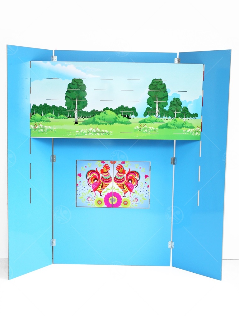 Ширма для кукольного театра нашего собственного производства уникальна, и купить её по лучшей цене Вы можете в нашем интернет магазине. Мы доставим его в любую точку России с помощью транспортных компаний, до Ваших дверей или до терминала. В дополнение к кукольному театру Вы можете приобрести дополнительные сменные двухсторонние экраны на различные тематики (зима, осень, весна, деревня)